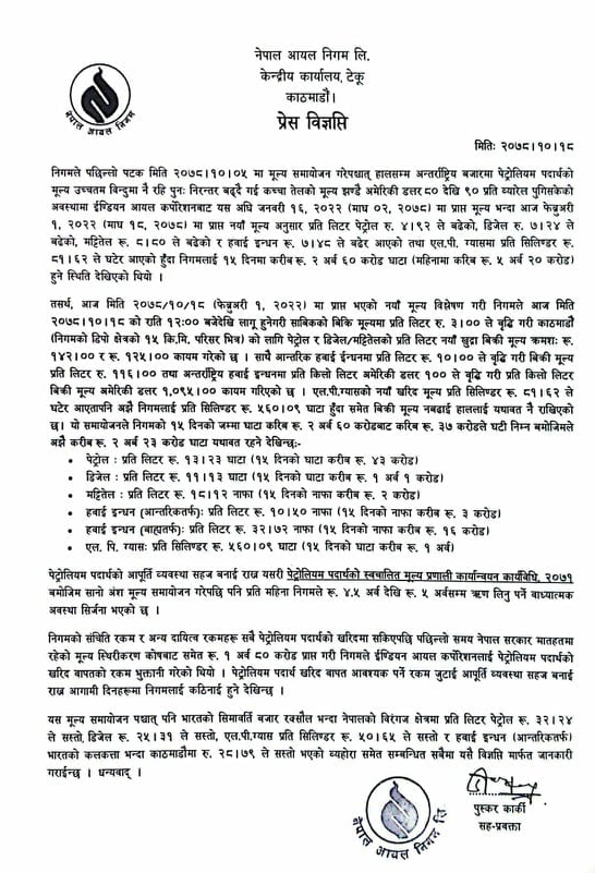 यसअघि निगमले माघ ५ गते पेट्रोलियम पदार्थको मूल्य बढाएको थियो ।